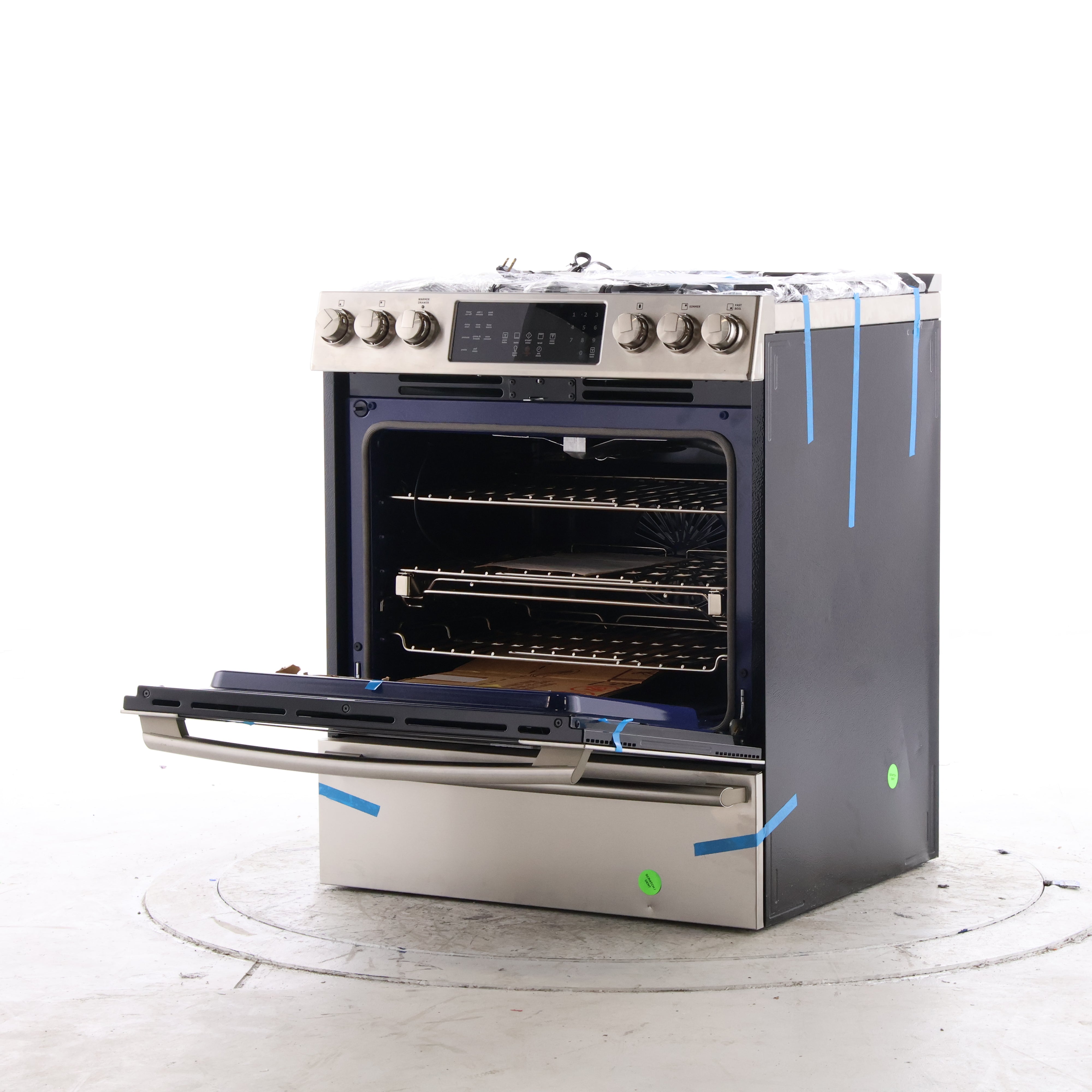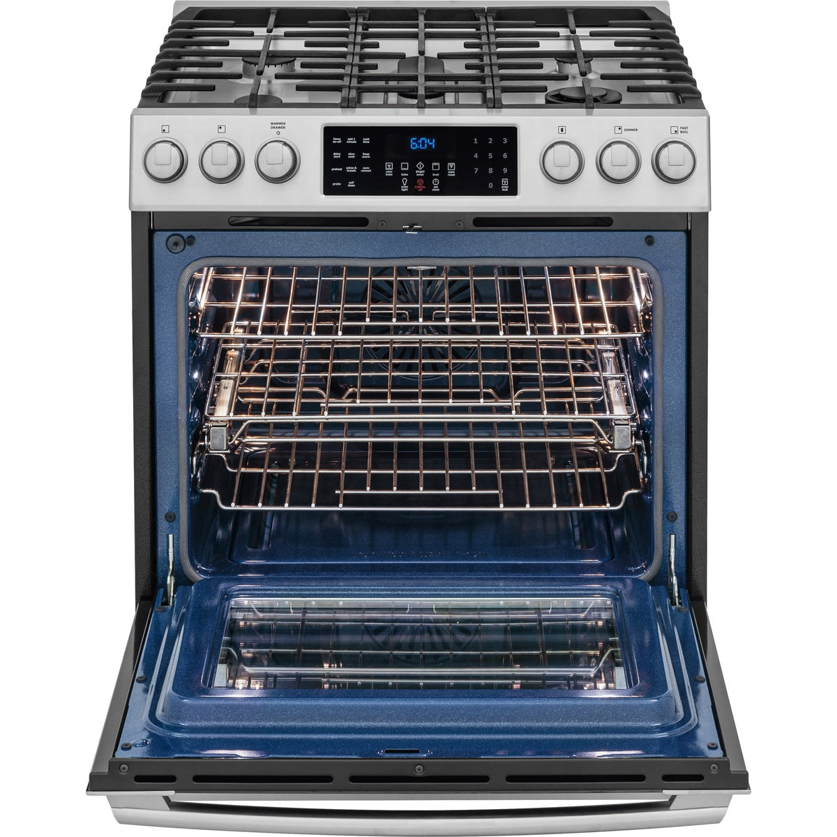 Open oven showing cobalt blue interior and multiple racks