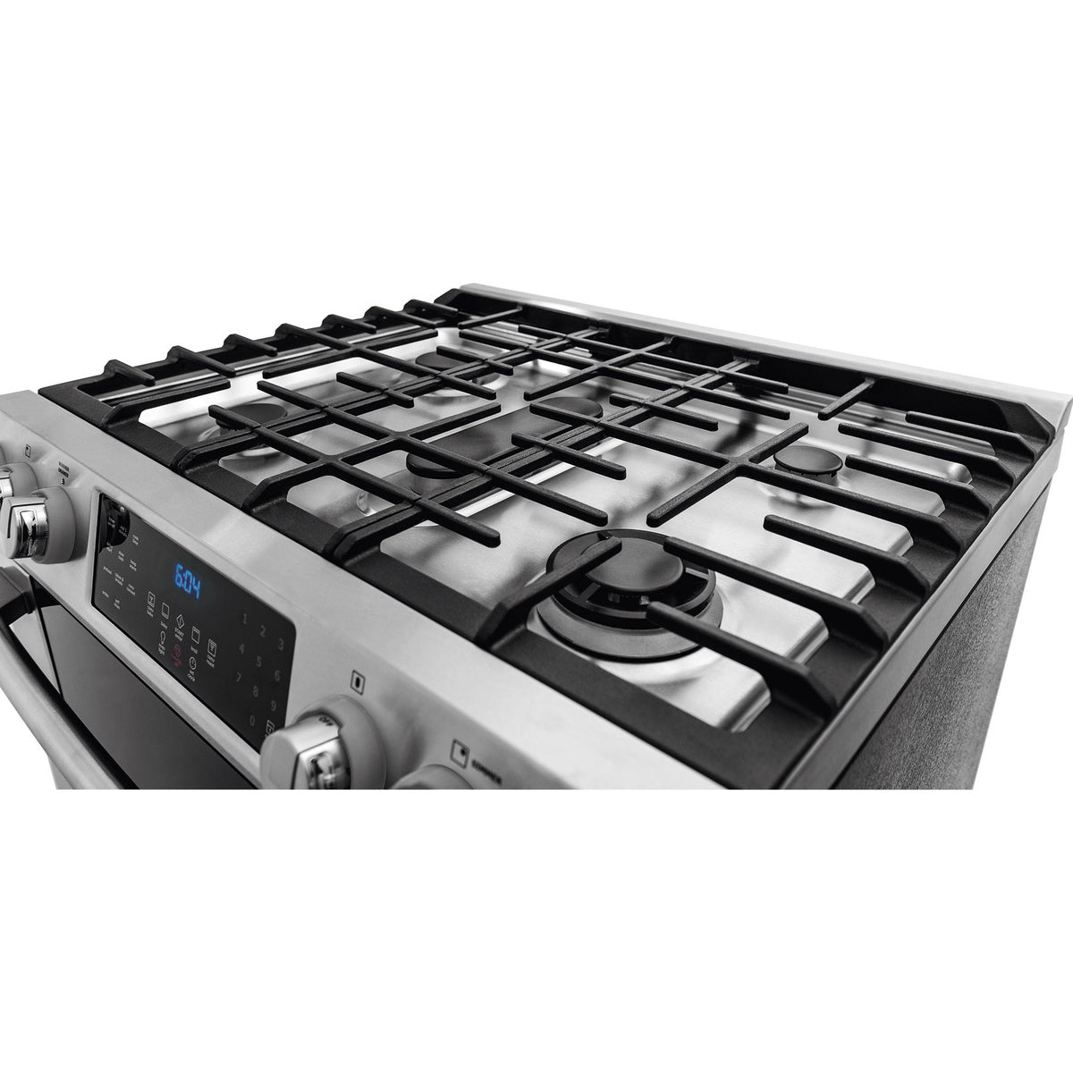 The continuous cast-iron grates let you slide cookware from burner to burner without lifting.