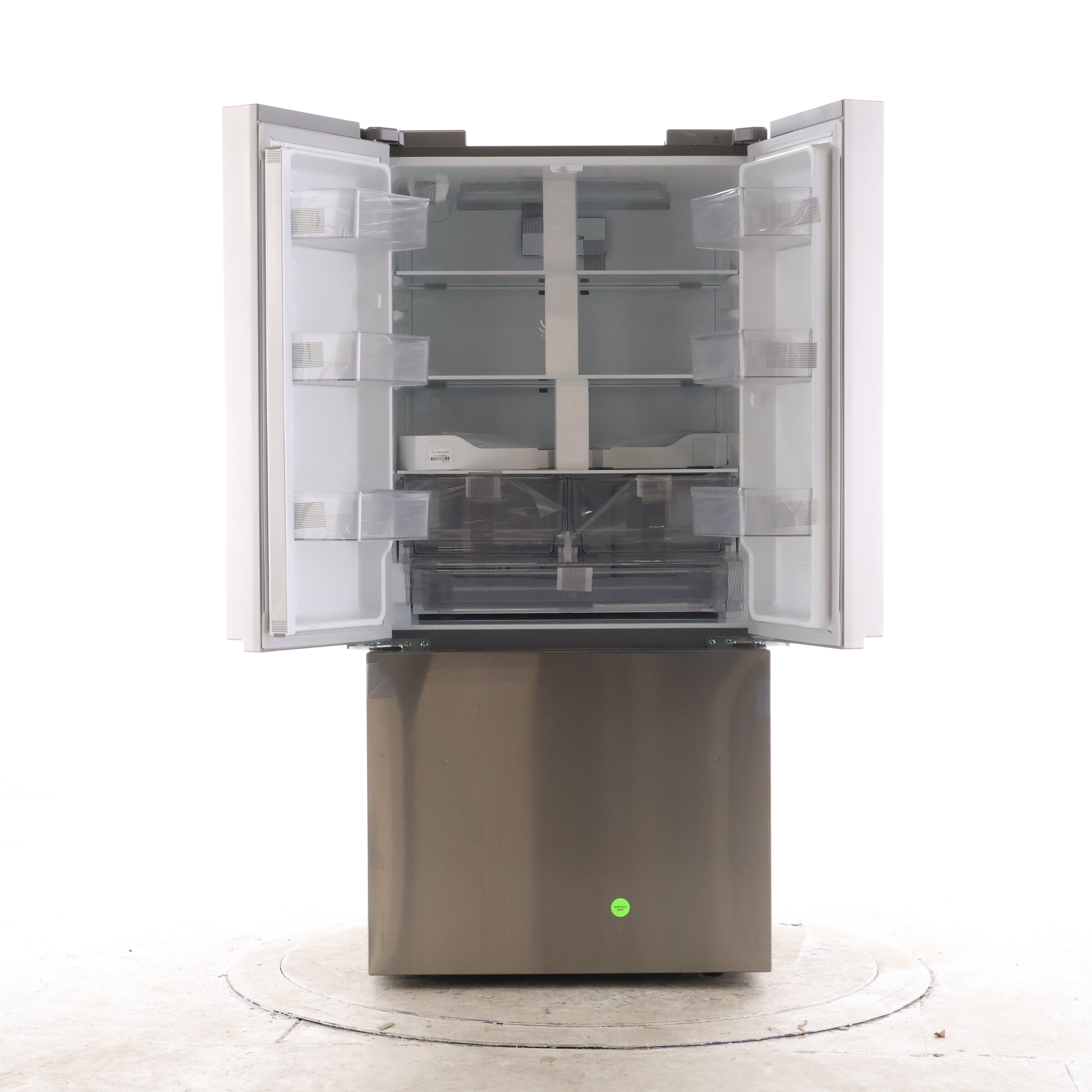 - French door convenience: Wide fresh-food access up top with a bottom freezer drawer for frozen items.