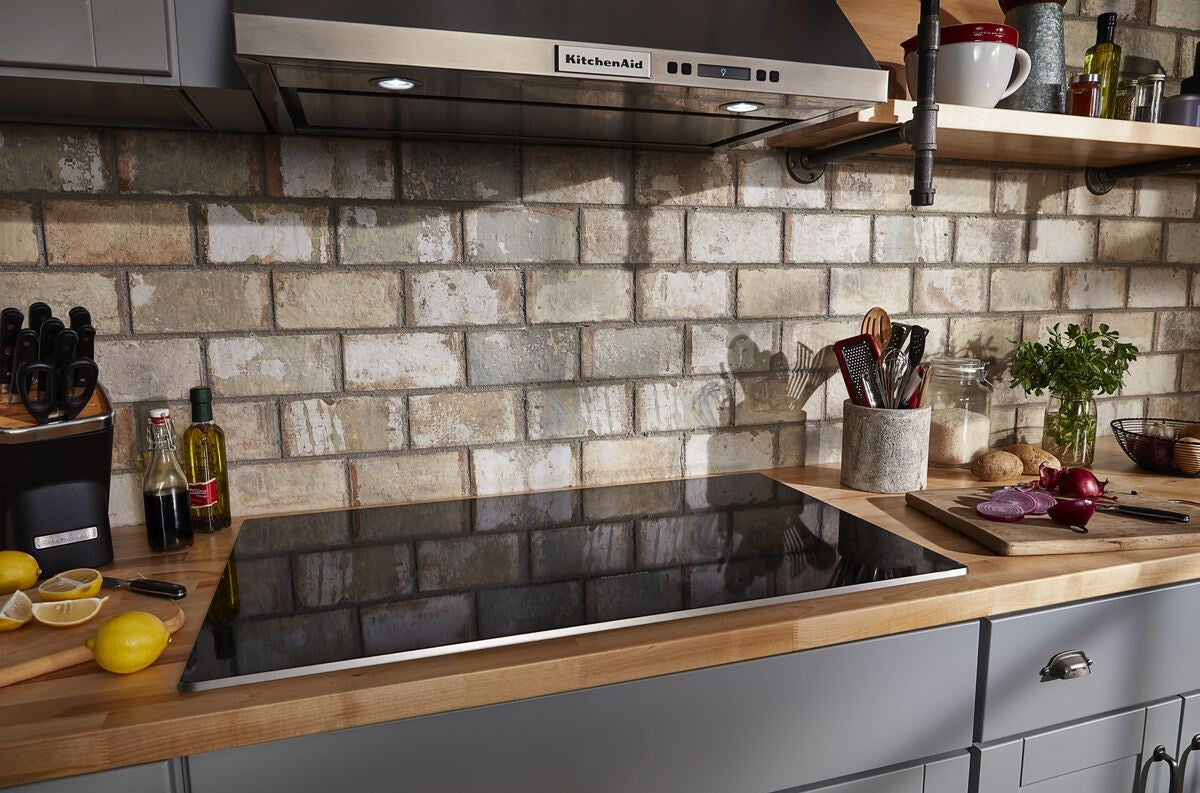 KitchenAid 36-inch electric cooktop installed in a modern kitchen countertop lifestyle scene