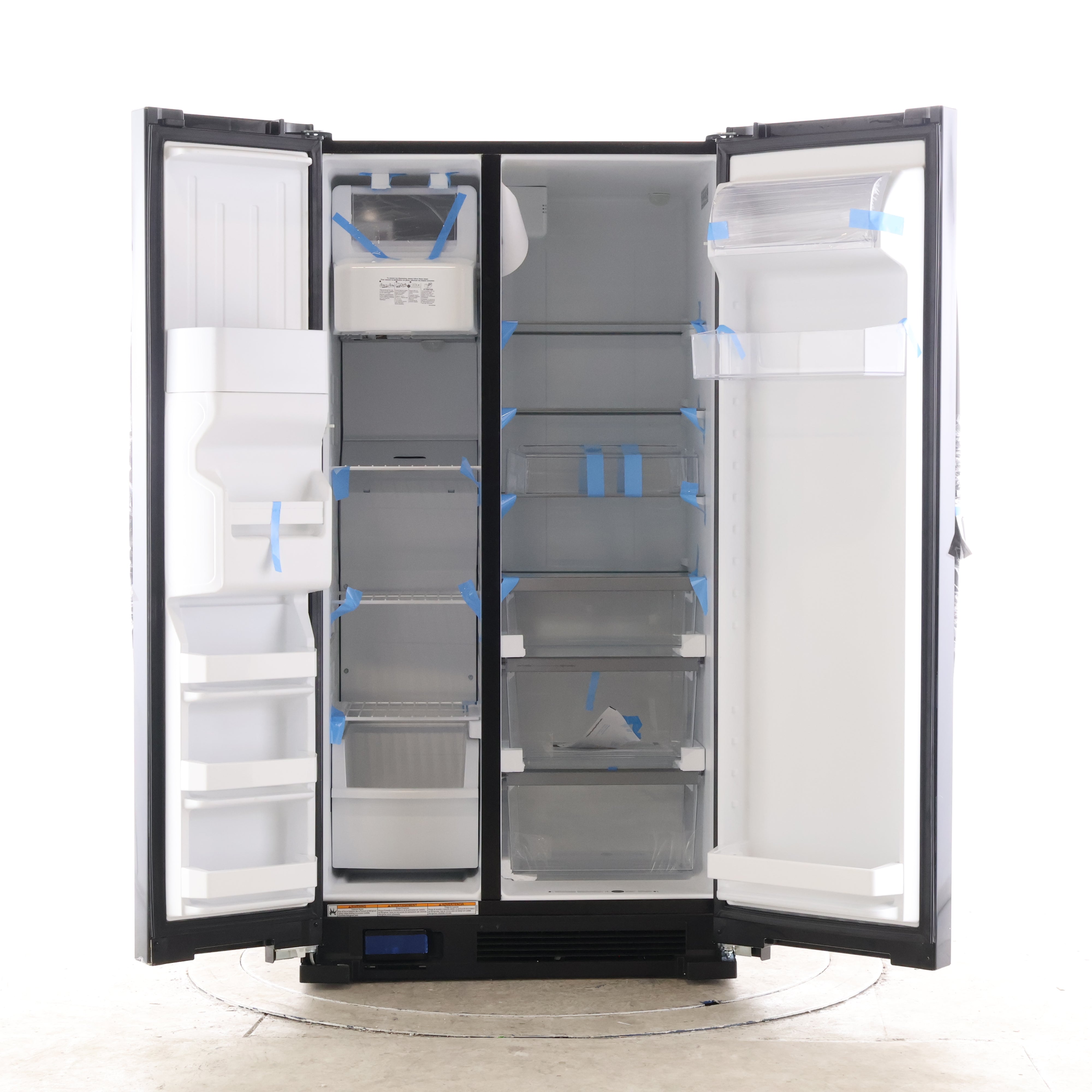 This side-by-side interior is designed for practical organization, with clear drawers, multiple shelves, and door bins to keep everyday items visible and easy to reach.