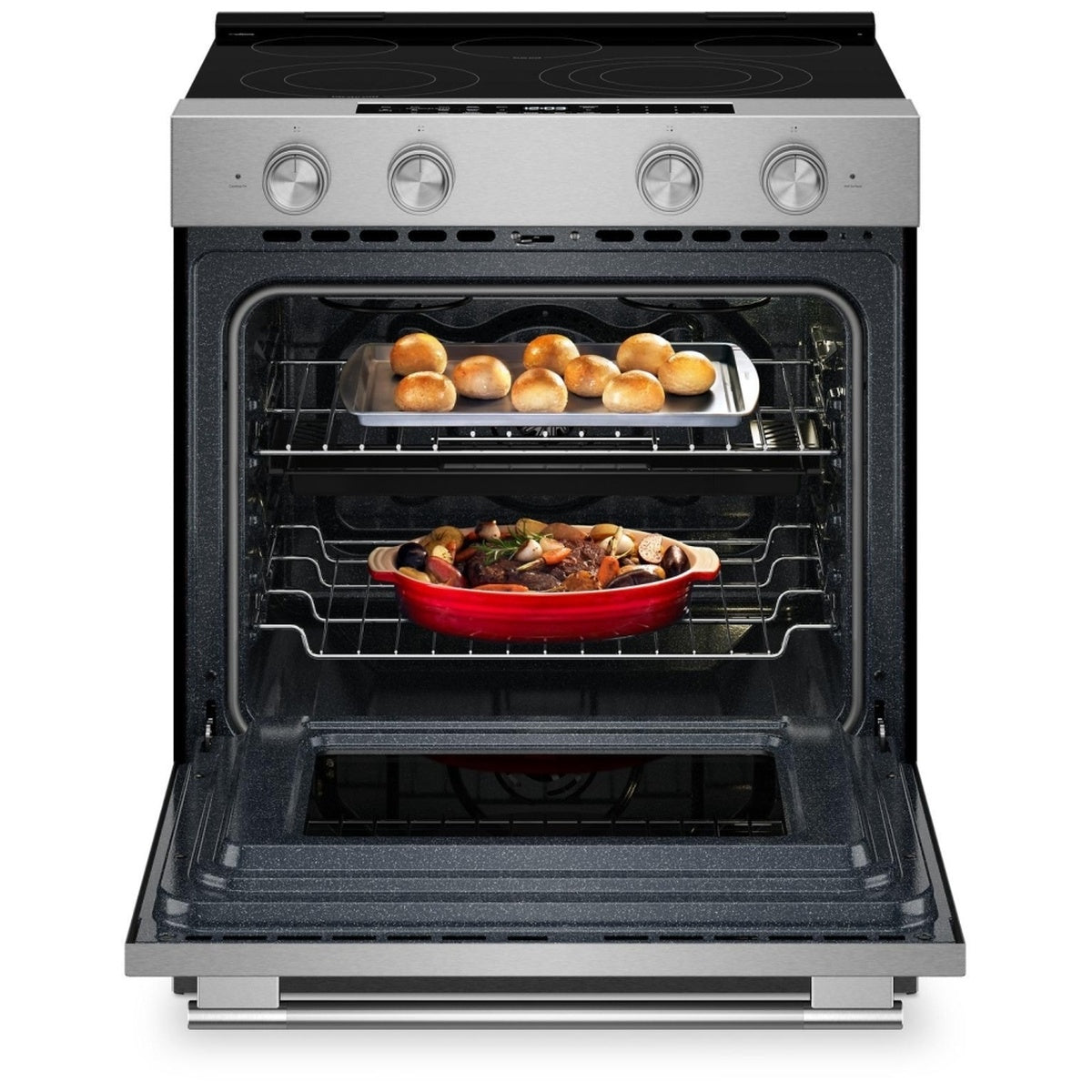 - Ideal for households that cook frequently and in volume: 5.3 cu. ft. of oven space with 5 rack guide positions lets you bake and roast across multiple levels simultaneously.