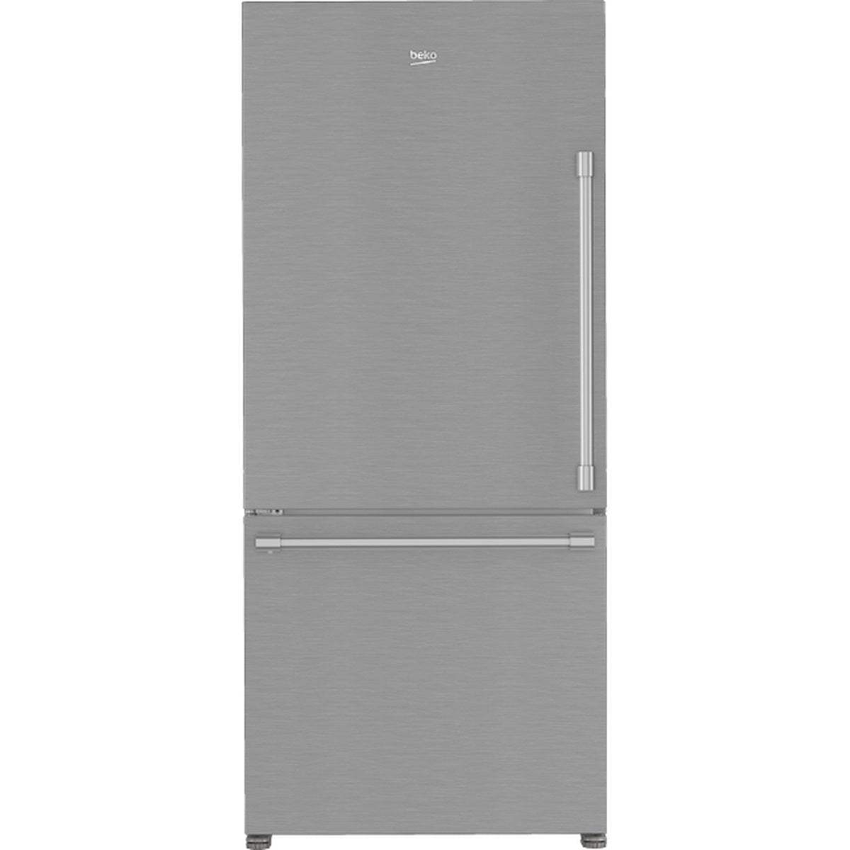 Front view of stainless steel Beko bottom-freezer refrigerator with long vertical handle