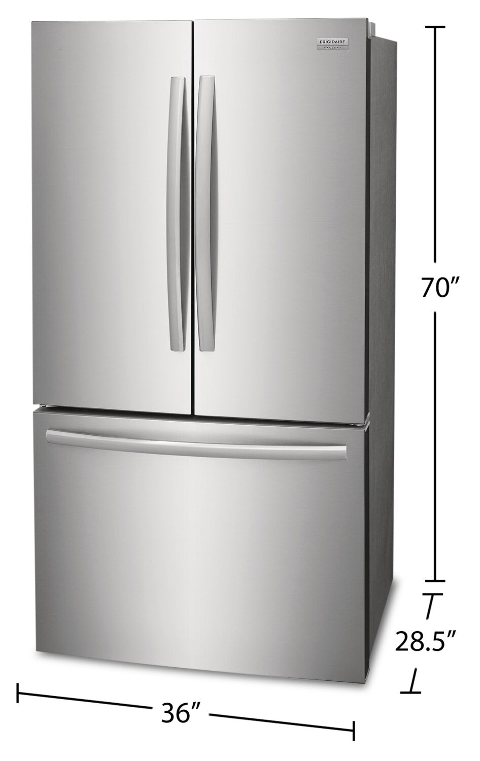 The Frigidaire GRFN2853AF is a full-size 36" French door refrigerator built for households that want maximum storage and easy organization. With 28.8 cu. ft. total capacity and a 70" height (with hinge), it is a strong choice when you want space over a counter-depth fit.