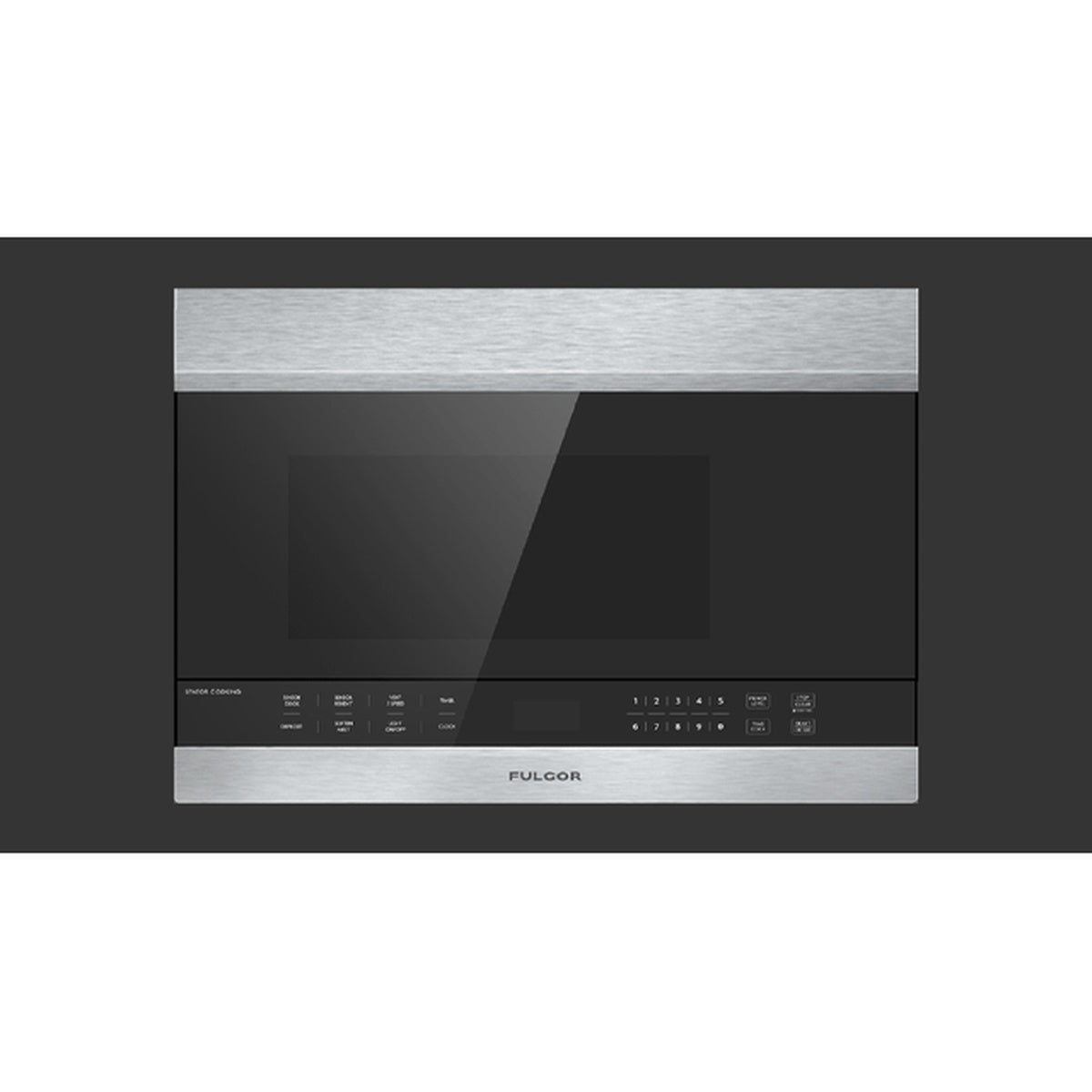 Front view of a Fulgor Milano microwave with stainless trim, dark glass door, and touch control panel