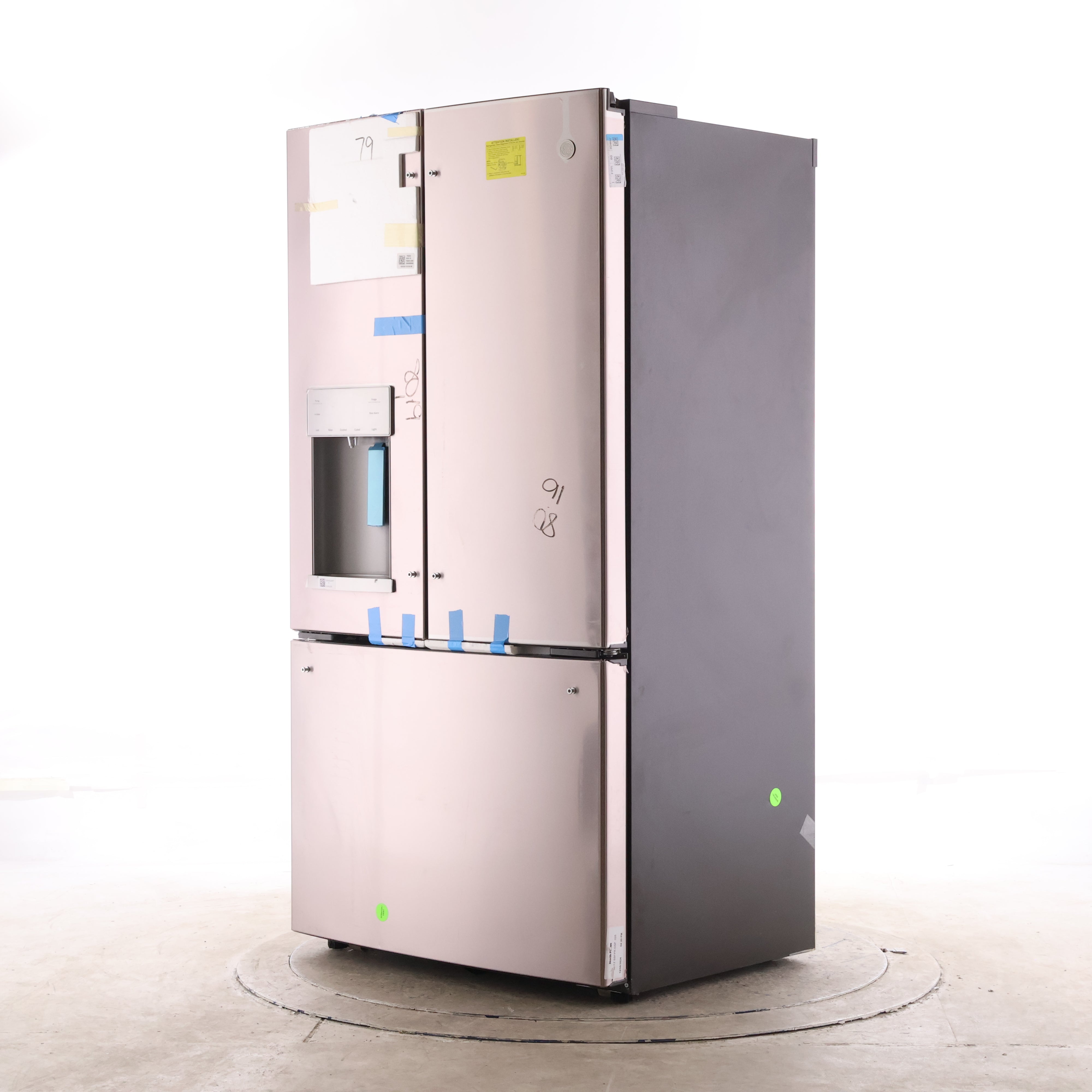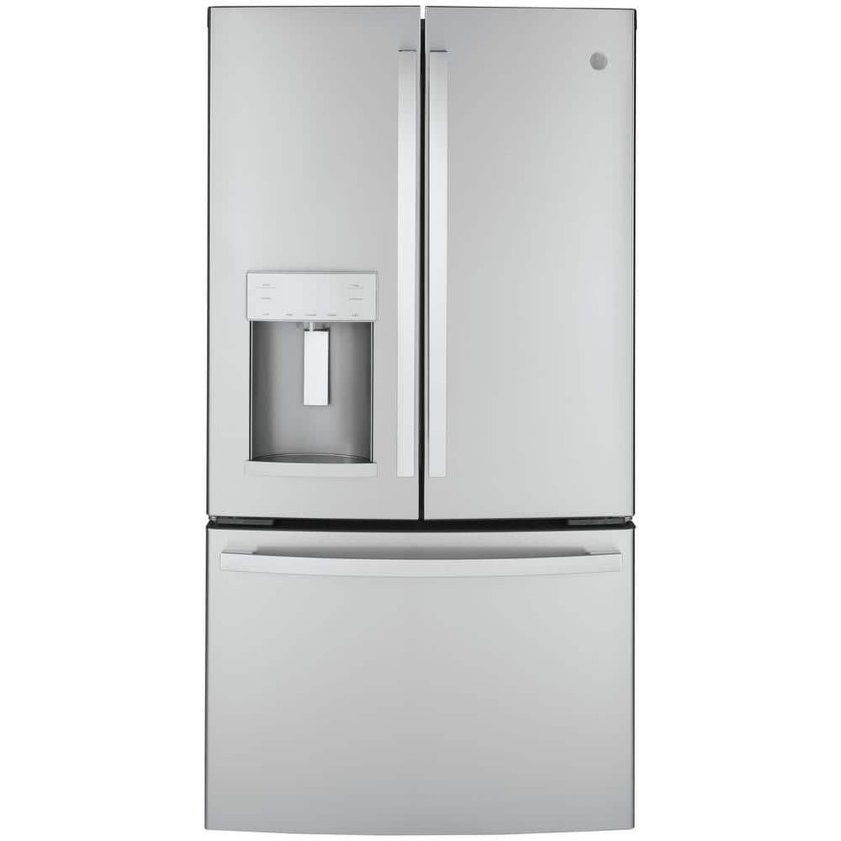 GE is a widely shopped, easy-to-own brand for mainstream kitchens, and this model highlights the practical exterior features many buyers want in a modern French door refrigerator.