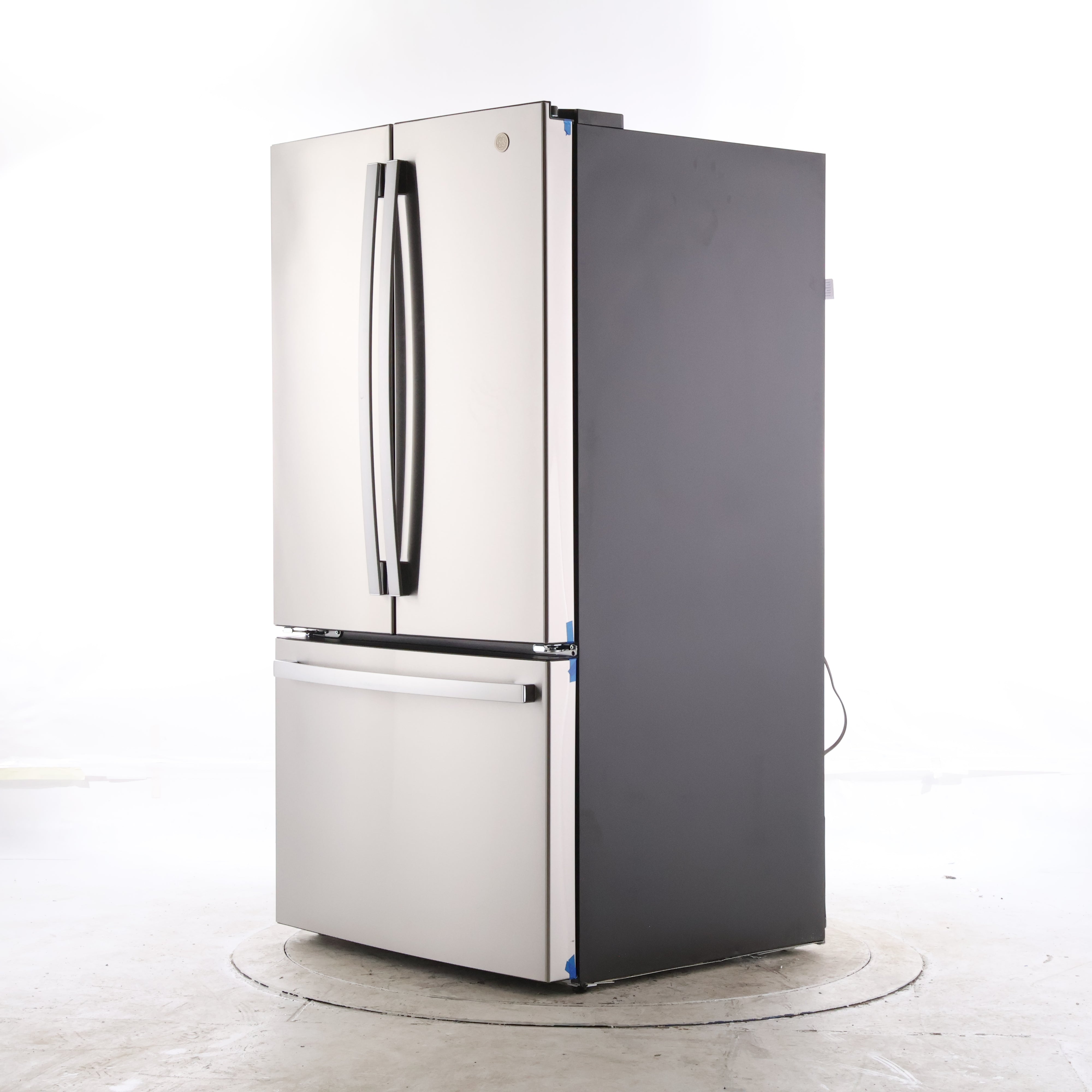 Front view of a GE fingerprint-resistant stainless French door refrigerator with bottom freezer drawer
