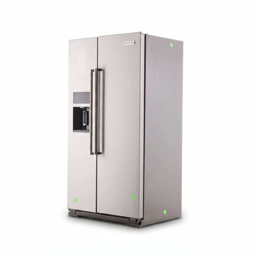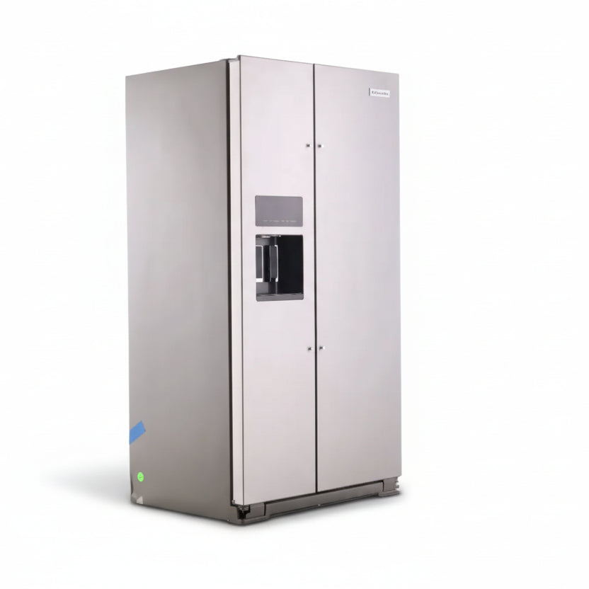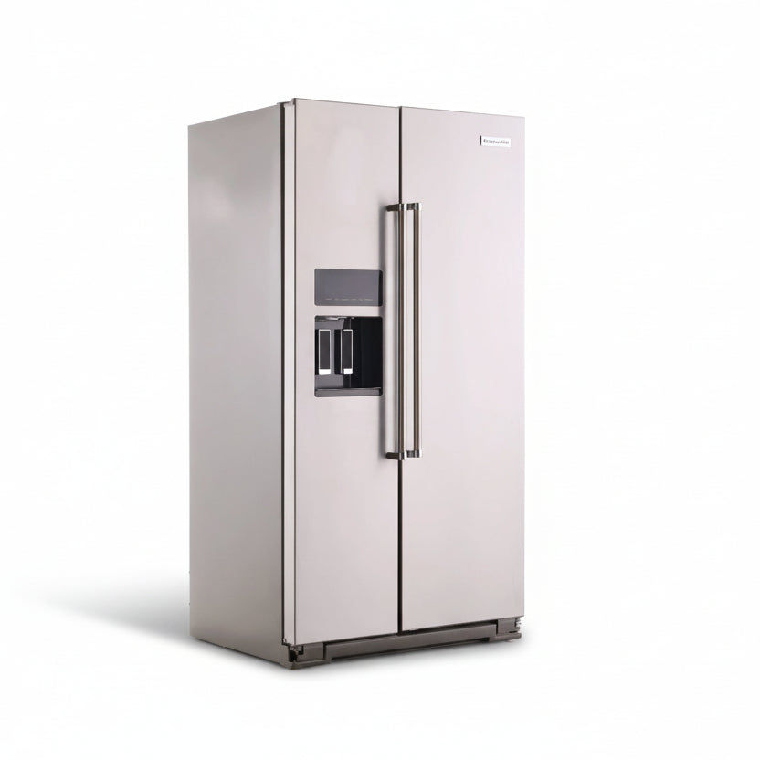 KitchenAid KRSC700HPS is a 36-inch counter-depth, freestanding side-by-side refrigerator with 19.8 cu. ft. total capacity, designed to sit nearly flush with cabinetry while keeping an exterior ice and water dispenser. Choose it when you want a streamlined built-in look and easy door dispensing; the main trade-off versus standard-depth models is less overall storage depth.