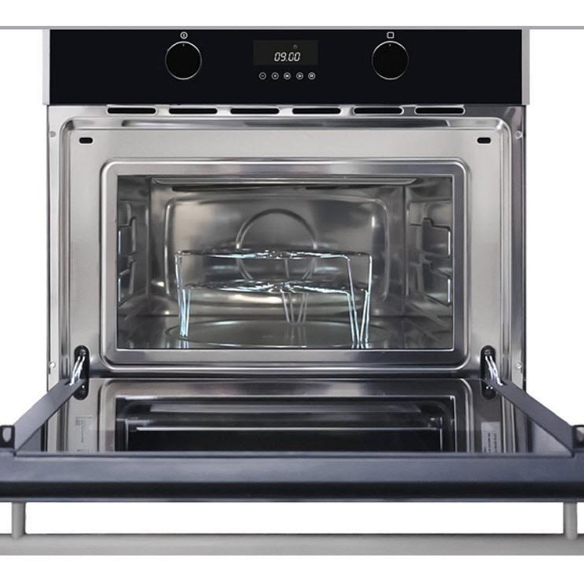 The MWPS60TM-1 combines 1,000W microwave power with a 1,500W grill element across 3 cooking functions, all managed through an intuitive digital touch display with dual dial knobs. A down-fold removable door, control lock, and halogen interior lighting set it apart from basic built-in models.