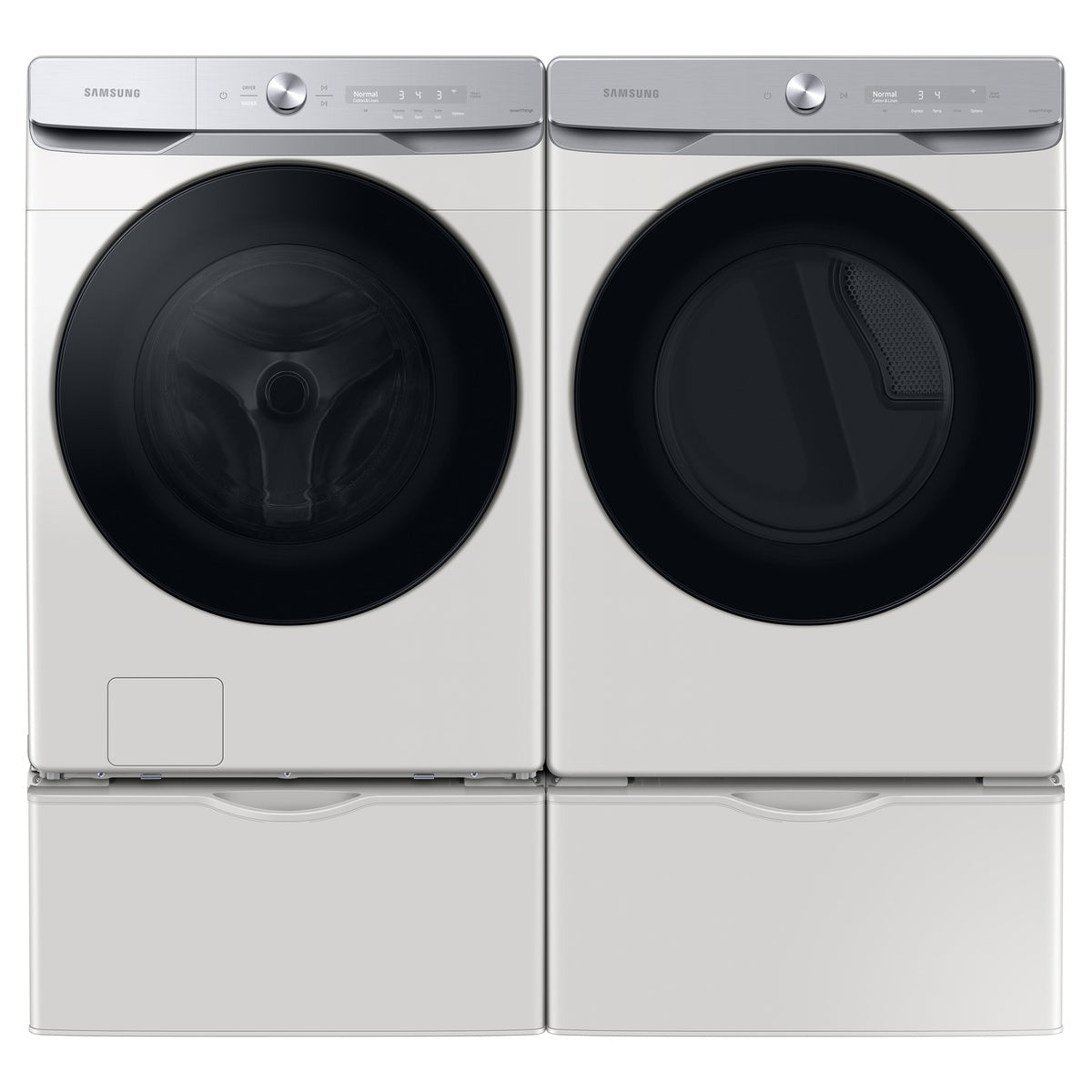 Samsung front-load washer and dryer shown side by side on matching pedestals with both storage drawers open