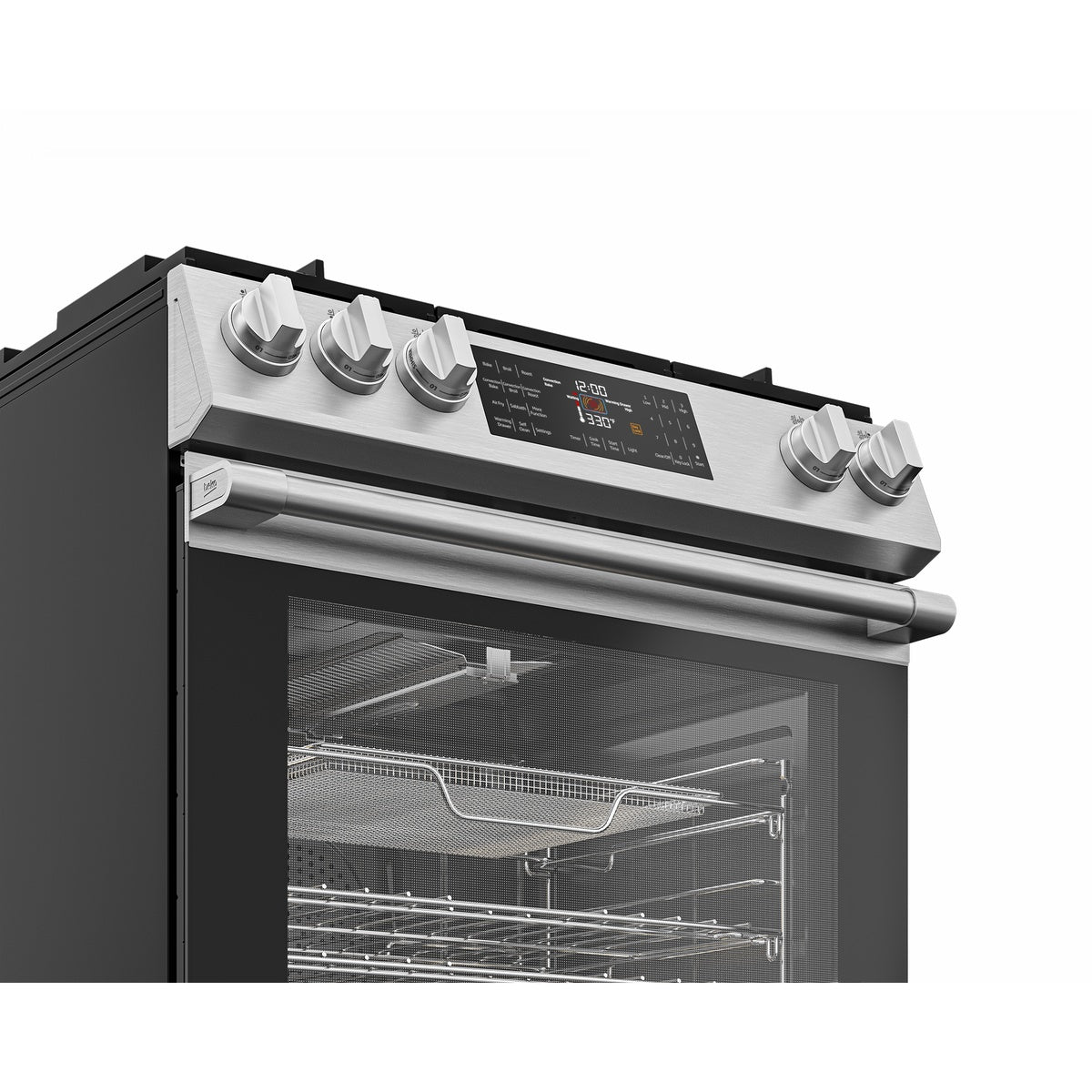 Angled close-up of the stainless control panel with knobs and digital touch display