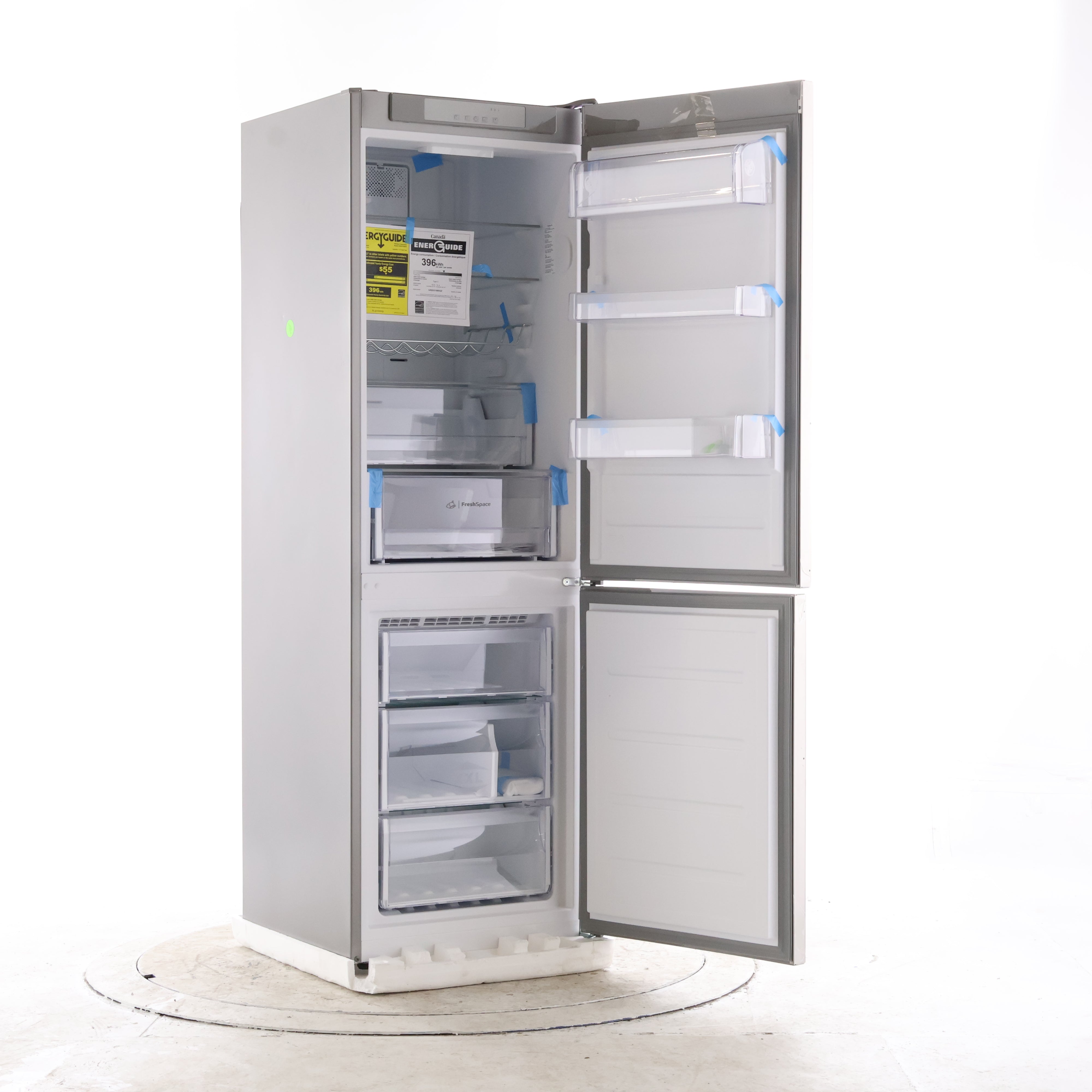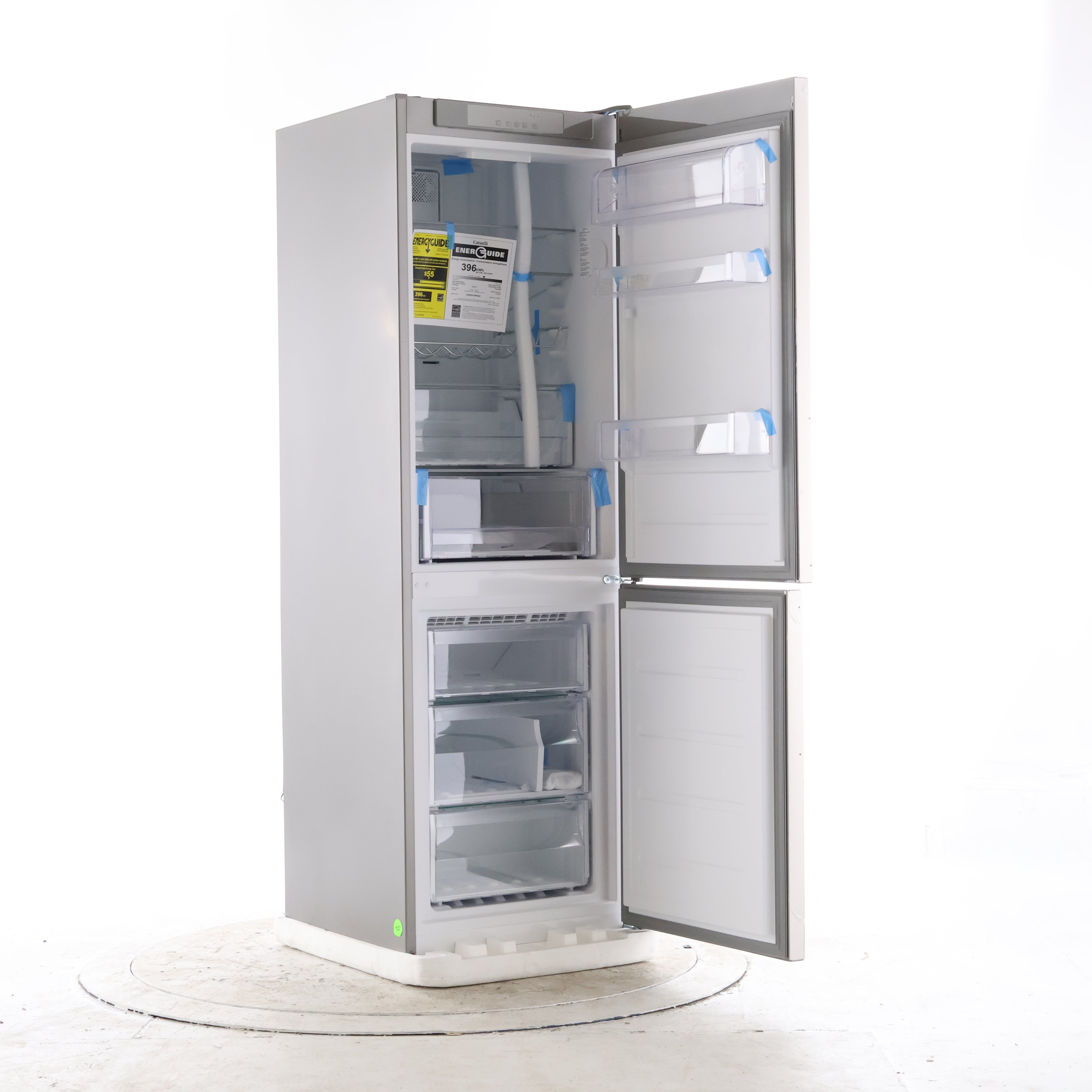 Inside, this model focuses on flexible, easy-to-see storage with clear compartments and shelf space for daily groceries. The bottom freezer uses stacked drawers to separate frozen foods for faster grab-and-go organization.