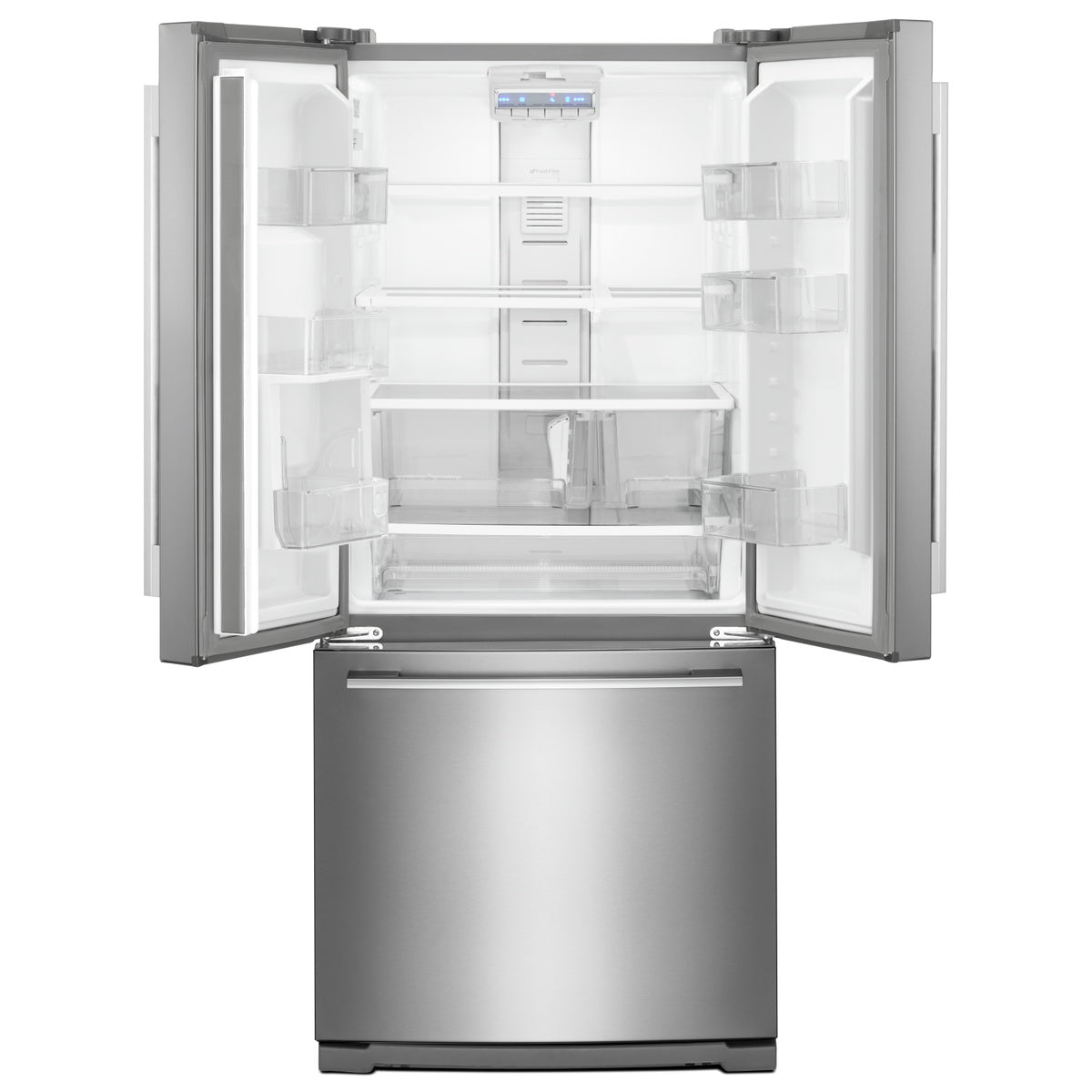 Front view of a stainless steel French door refrigerator with bottom freezer drawer