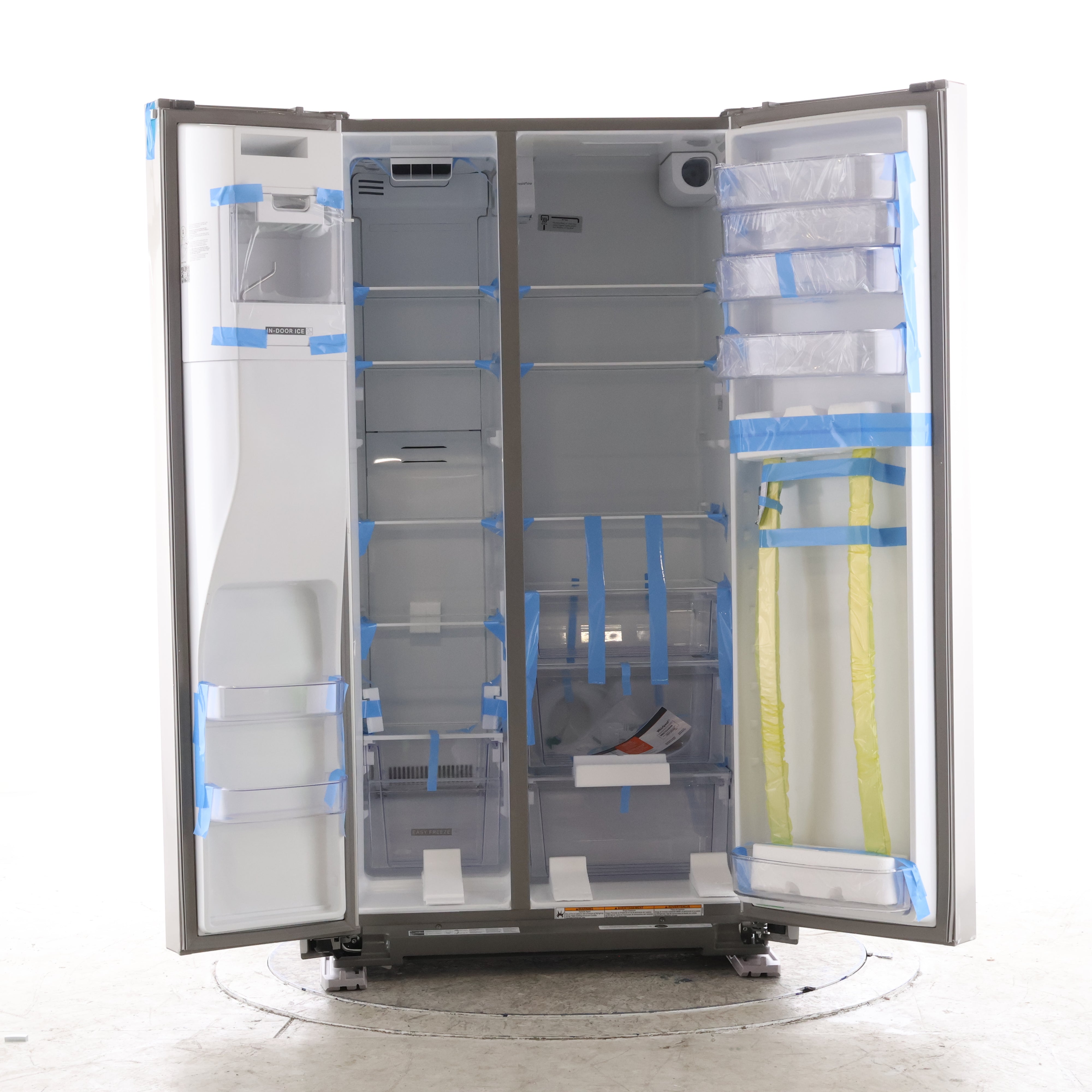 Right refrigerator door open showing shelves, drawers, and clear door bins.