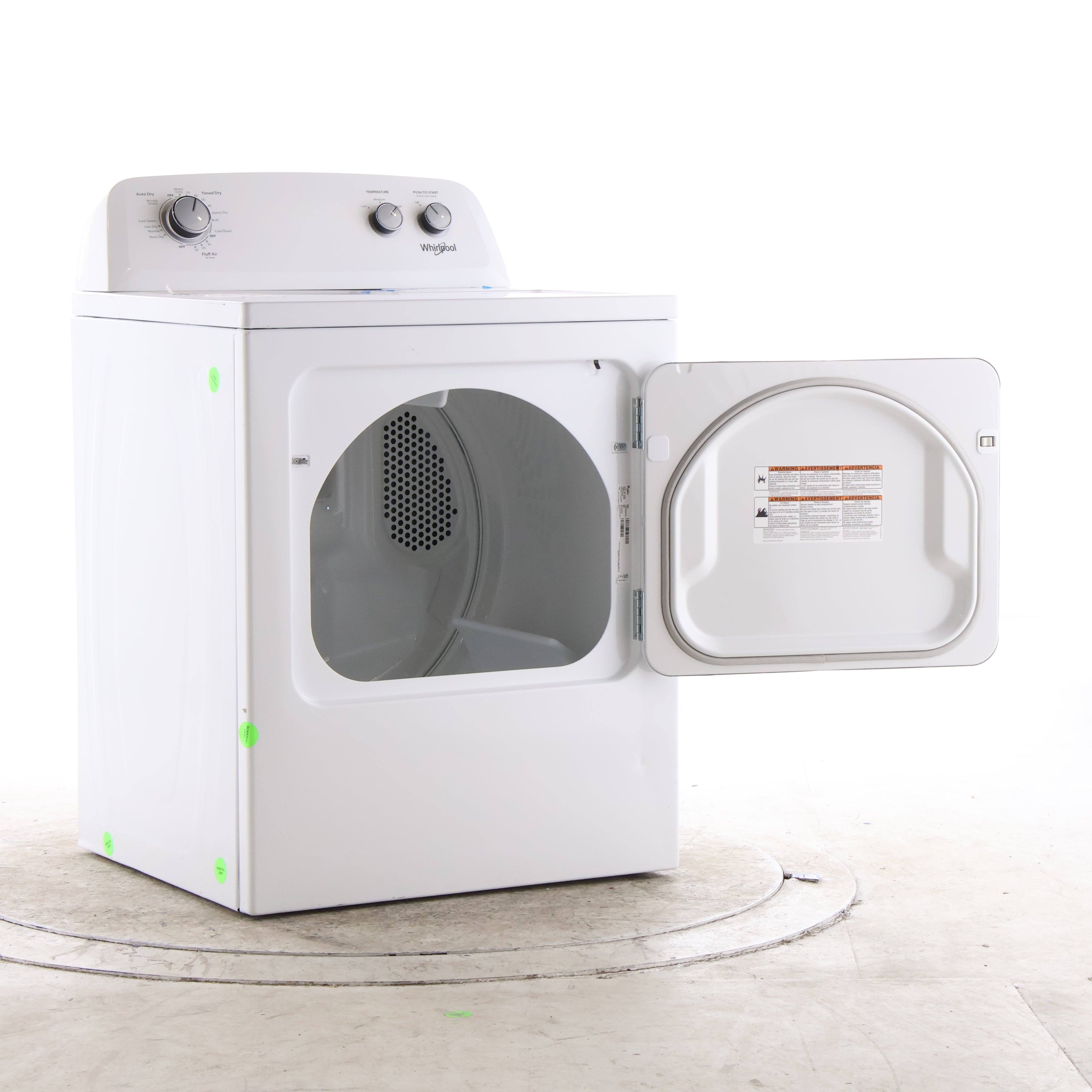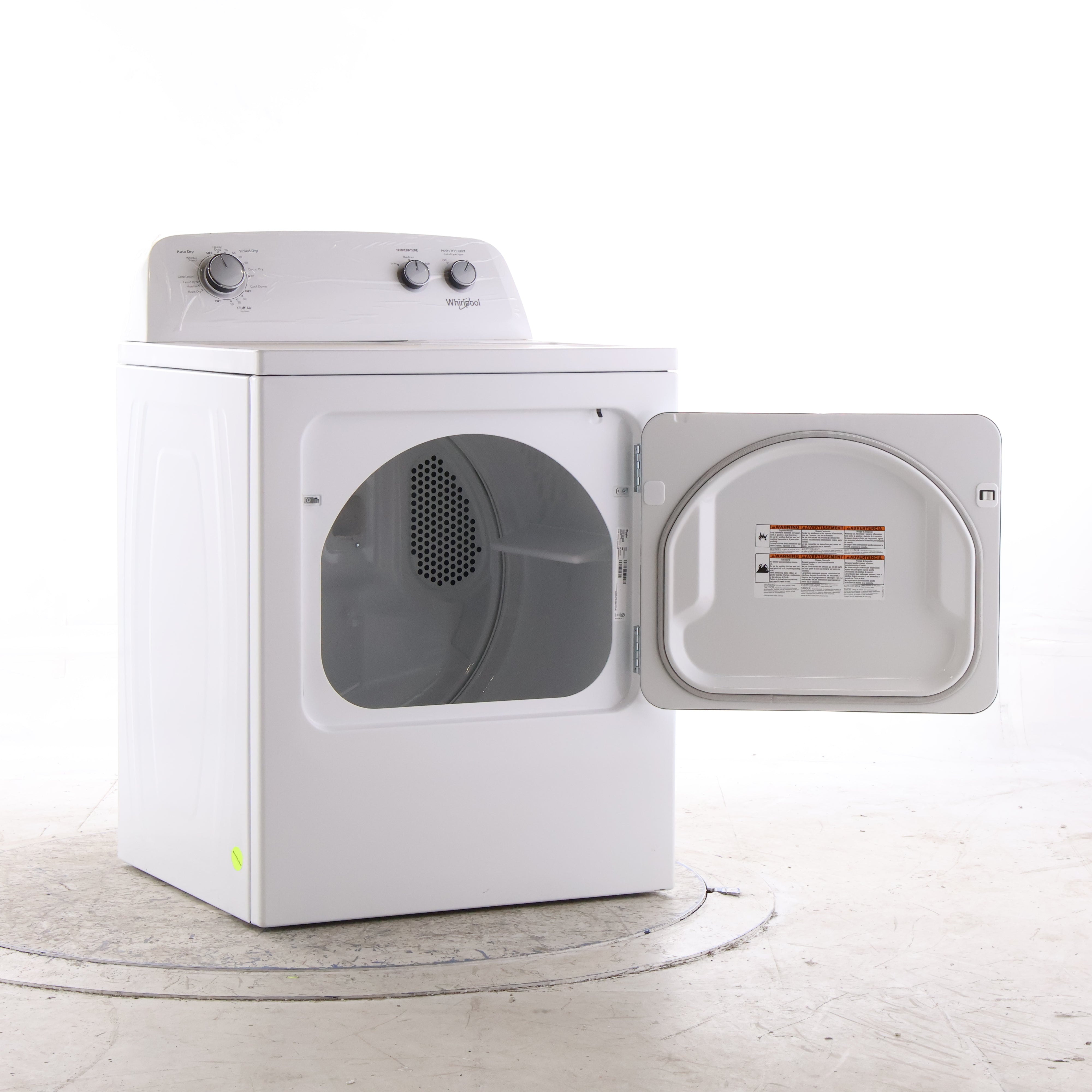 Whirlpool dryer with the door open showing the drum interior and drum light